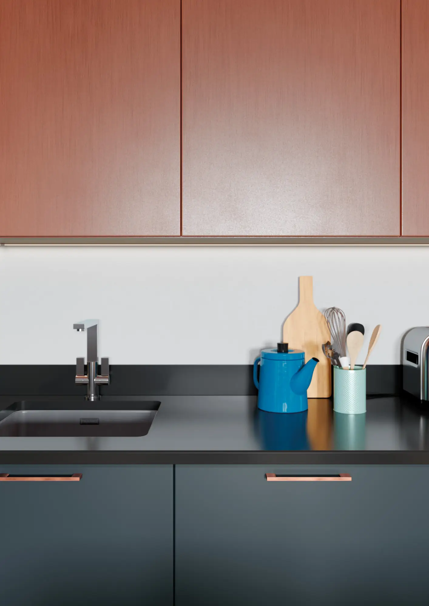 Zola Matte Marine and Ferro Copper with Rezana Light Oak Kitchen