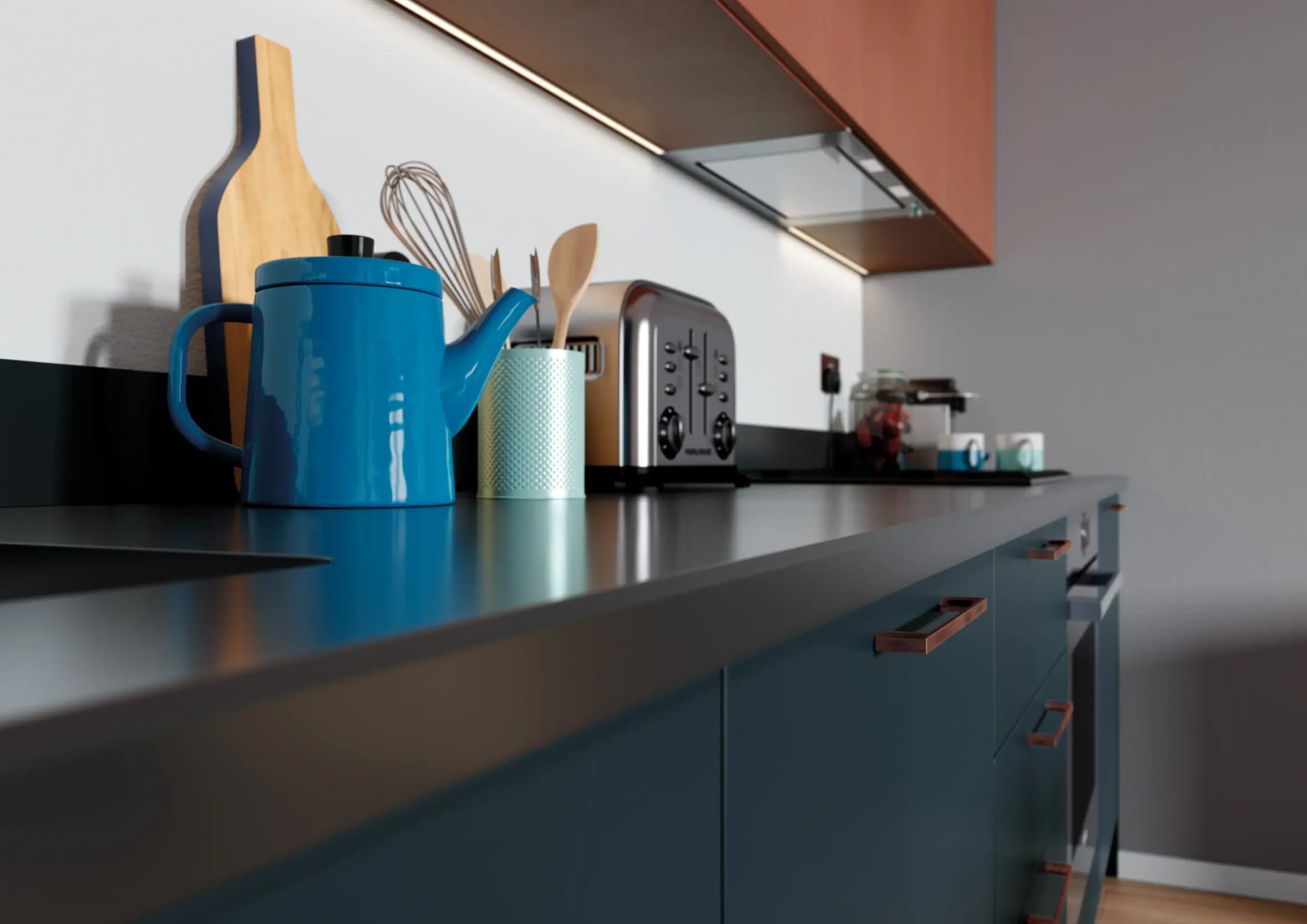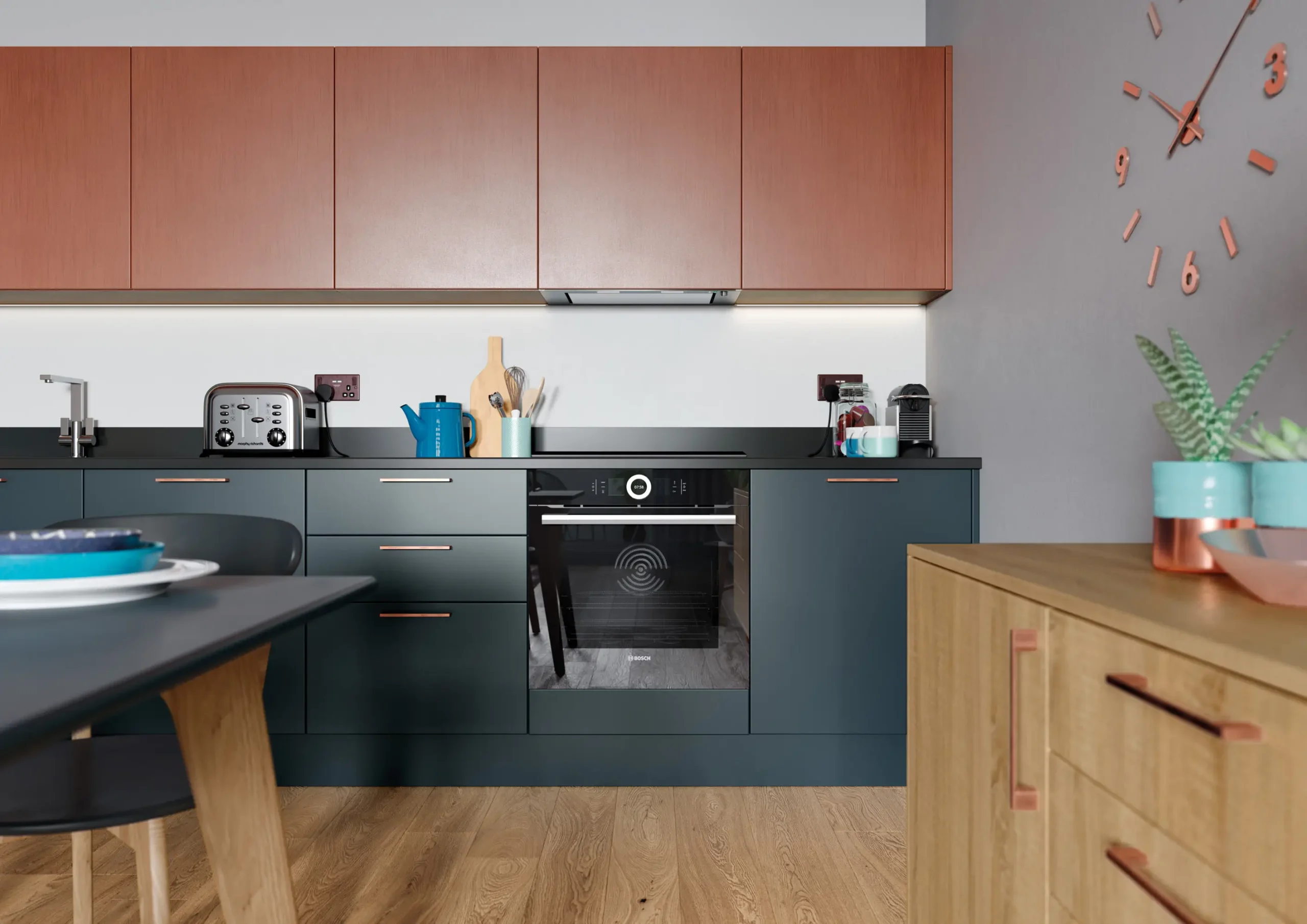Visit our showroom to explore the Zola Matte Marine and Ferro Copper with Rezana Light Oak Kitchen in full detail. From layout inspiration to personalised design guidance, our expert team will help you bring this fresh and contemporary look into your home.